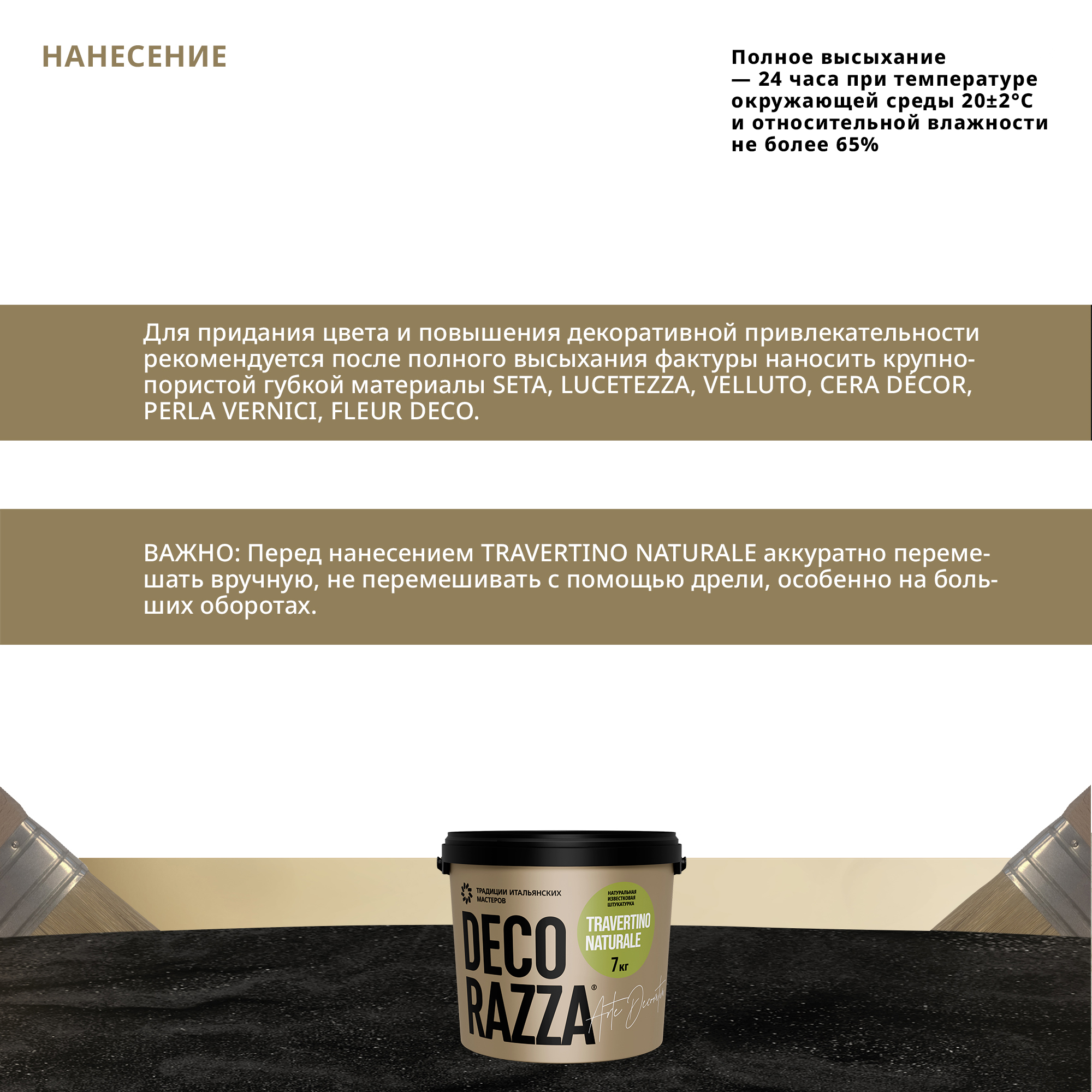 1. Перед нанесением Travertino naturale аккуратно перемешать вручную, не перемешивать с помощью дрели, особенно на больших оборотах! Материал готов к применению.
