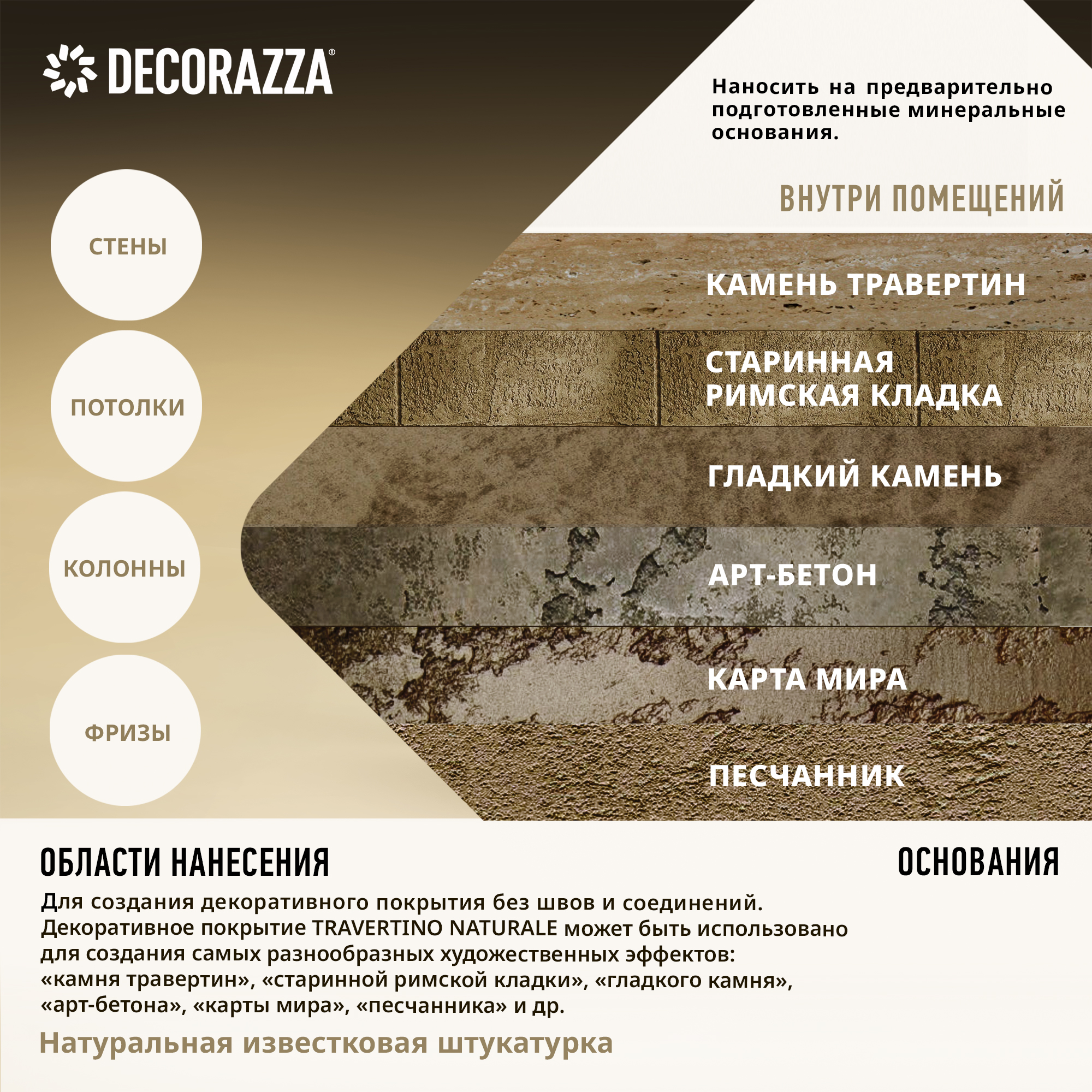 Для создания декоративного покрытия без швов и соединений на стенах, потолках, колоннах, фризах и других архитектурных деталях внутри помещений. Декоративное покрытие Travertino naturale может быть использовано для создания самых разнообразных художественных эффектов: «камня травертин», «старинной римской кладки», «гладкого камня», «арт- бетона», «карты мира», «песчанника» и др.