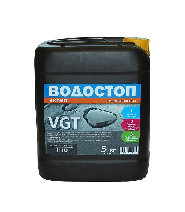 Грунт-концентрат Водостоп-акрил ВГТ  -  Грунт-концентрат "Водостоп-акрил ВГТ" — это инновационное средство для защиты ваших поверхностей от влаги и воды. Этот акриловый грунт отличается высокой концентрированностью, обеспечивая глубокое проникновение в структуру минеральных материалов и дерева. Благодаря своим гидроизоляционным свойствам, он создает надежную защиту от влаги, обеспечивая долговечность и устойчивость конструкции. "Водостоп-акрил ВГТ" обладает исключительной водостойкостью, что делает его идеальным выбором для использования в условиях повышенной влажности или при необходимости предотвращения проникновения влаги. Отличается также отсутствием запаха, что позволяет применять его как внутри помещений, так и снаружи, не создавая неприятных ощущений. Этот грунт идеально подходит для широкого спектра применения — от ремонта и строительства до декоративной отделки. Его способность проникать глубоко в поры материала обеспечивает превосходное сцепление с поверхностями, делая последующие работы по окрашиванию или нанесению других покрытий более эффективными и долговечными. от бренда VGT-ecology material с доставкой по России!