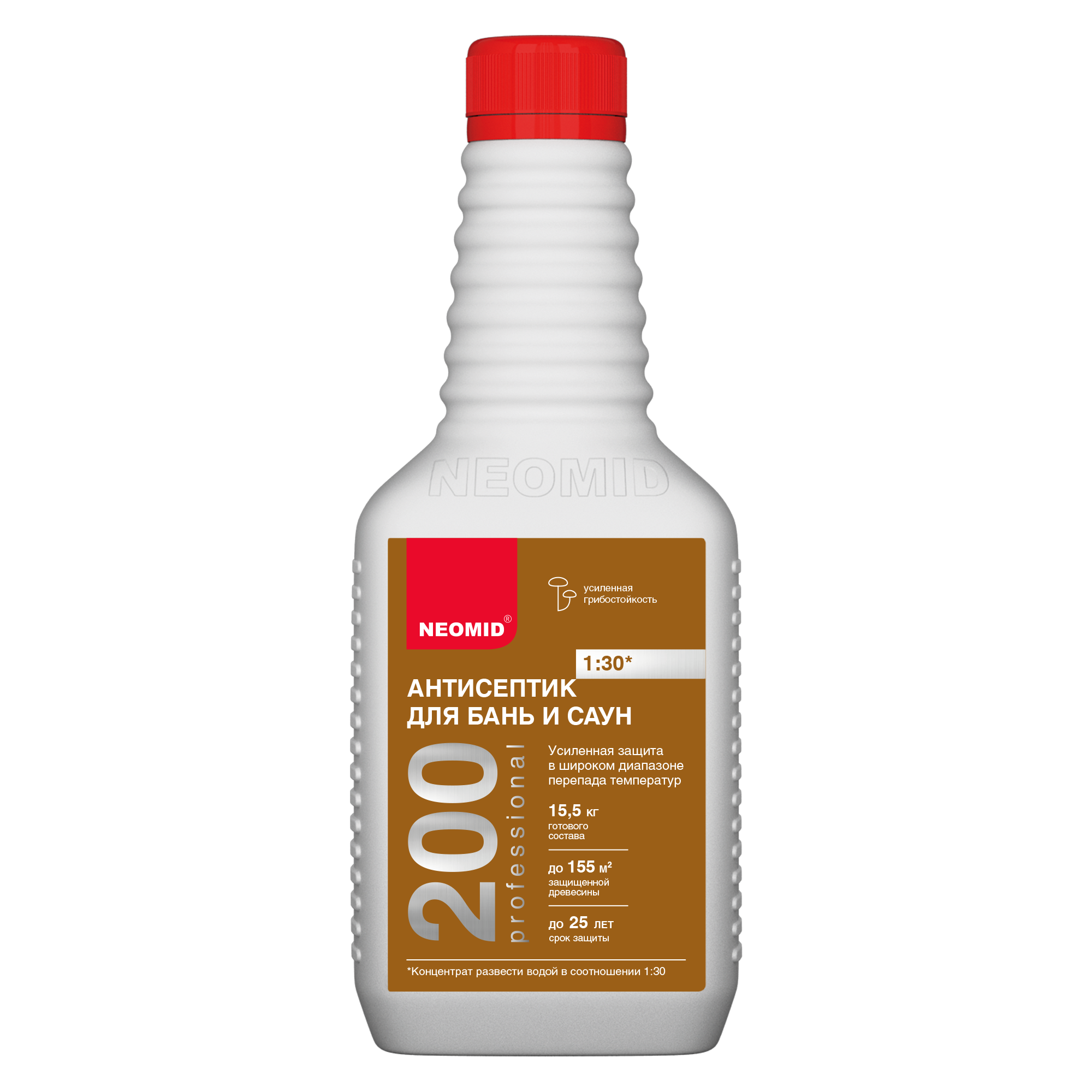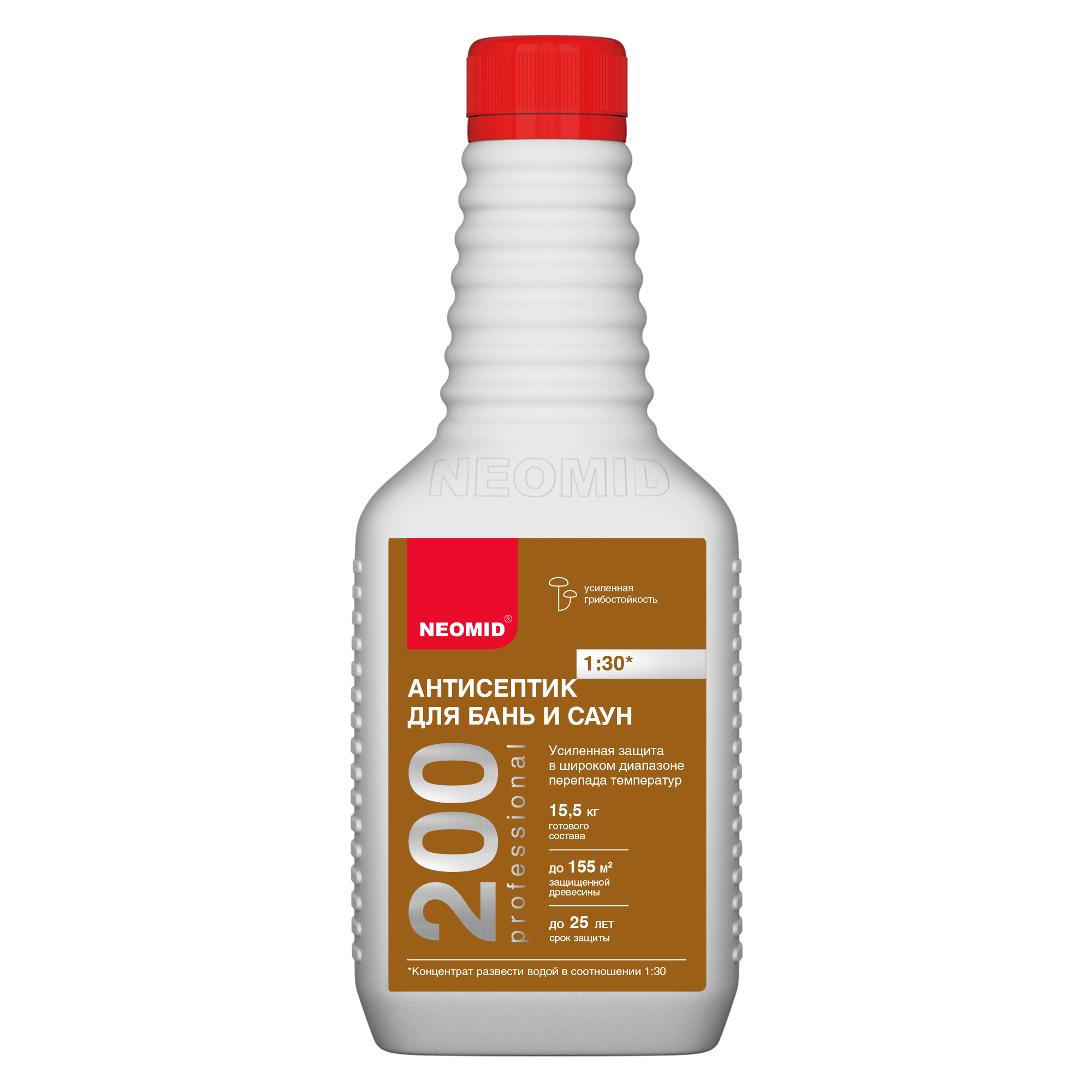 Неомид 200 1:30 и Неомид 200 1:5 – новое высокоэффективное средство для усиленной защиты древесины внутри бань и саун, включая полки и скамейки. Обеспечивает сверхвысокую защиту древесины от гниения, дереворазрушающих и деревоокрашивающих плесневых грибов, в условиях частого перепада температур и повышенной влажности на срок до 25 лет.