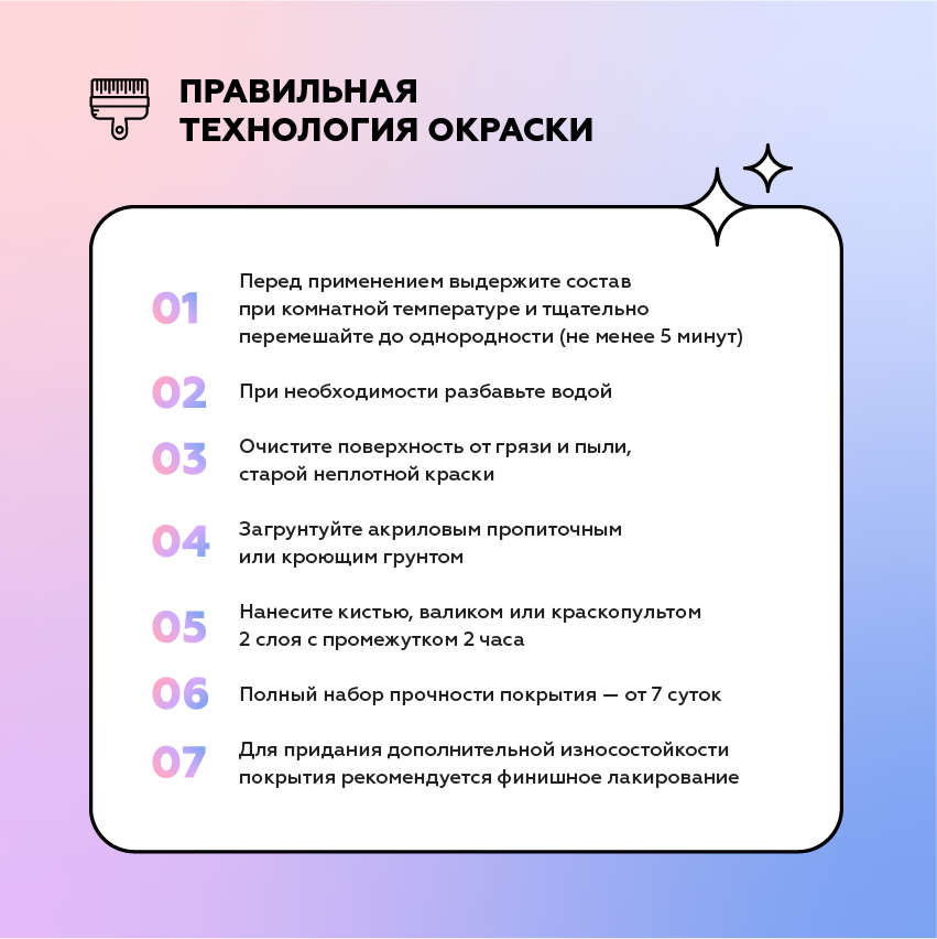 Рекомендуется нанесение в 2 слоя с промежуточной сушкой 2 часа.