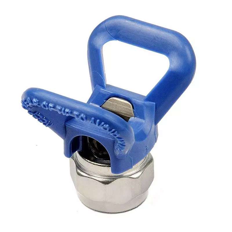 Соплодержатель имеет резьбу для прикручивания к безвоздушному краскопульту - 7/8". Спереди имеет цветные "губы" для предотвращения попадания пальцев рук маляра при смене сопел, и предотвращения повреждений и травм маляра.